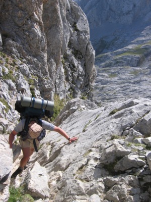 The next morning we left for Refugio J Ramon Lueje (2100 msl). Our route took us up between Diente de Urriellu and Corona del Razu. All the time we looked down on the clouds to the north. For while Tomoki and I thought we could see the white cliffs of Dover in the distance. We abandoned the idea as we noticed Britain had clearly moved towards France, upsetting both the British and the French.